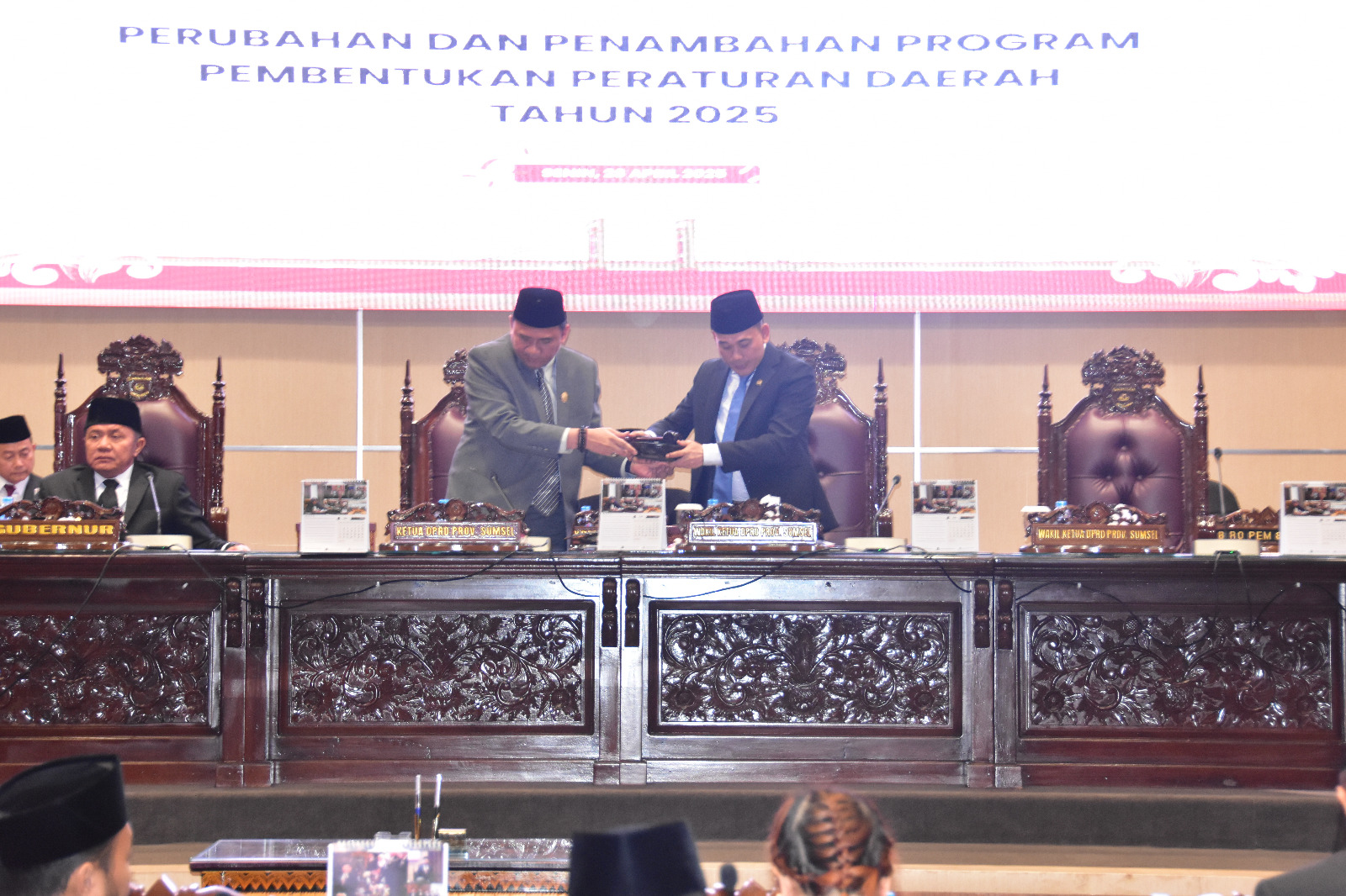 Agenda rapat paripurna pun diakhiri dengan prosesi penandatanganan Keputusan DPRD Provinsi Sumatera Selatan Tentang Perubahan Atas Keputusan DPRD Provinsi Sumatera Selatan Nomor 202 Tahun 2024 Tentang Penetapan Program Pembentukan Peraturan Daerah Provinsi Sumatera Selatan Tahun 2025 yang rancangannya telah dibacakan terlebih dahulu oleh Sekretaris DPRD Prov.Sumsel dan disetujui oleh peserta rapat yang hadir.