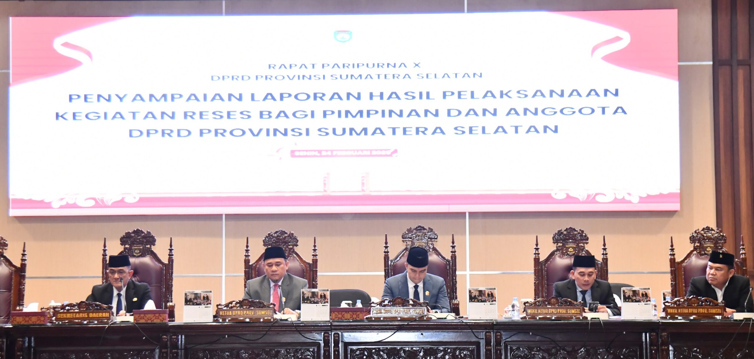 Dewan Perwakilan Rakyat Daerah (DPRD) Provinsi Sumatera Selatan menggelar Rapat Paripurna X (10) dengan agenda penyampaian laporan hasil pelaksanaan kegiatan reses bagi Pimpinan dan Anggota DPRD Provinsi Sumatera Selatan. Reses yang berlangsung dari tanggal 10 hingga 17 Februari 2025 tersebut bertujuan untuk menyerap aspirasi masyarakat secara langsung di 10 daerah pemilihan (Dapil) di Sumatera Selatan. Rapat Paripurna ini berlangsung di Ruang Rapat Paripurna DPRD Provinsi Sumatera Selatan pada Senin (24/2/2025).